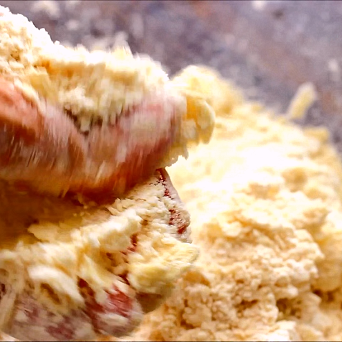Ensuite, nous mettons le beurre en morceaux et nous le mélangeons avec nos mains.